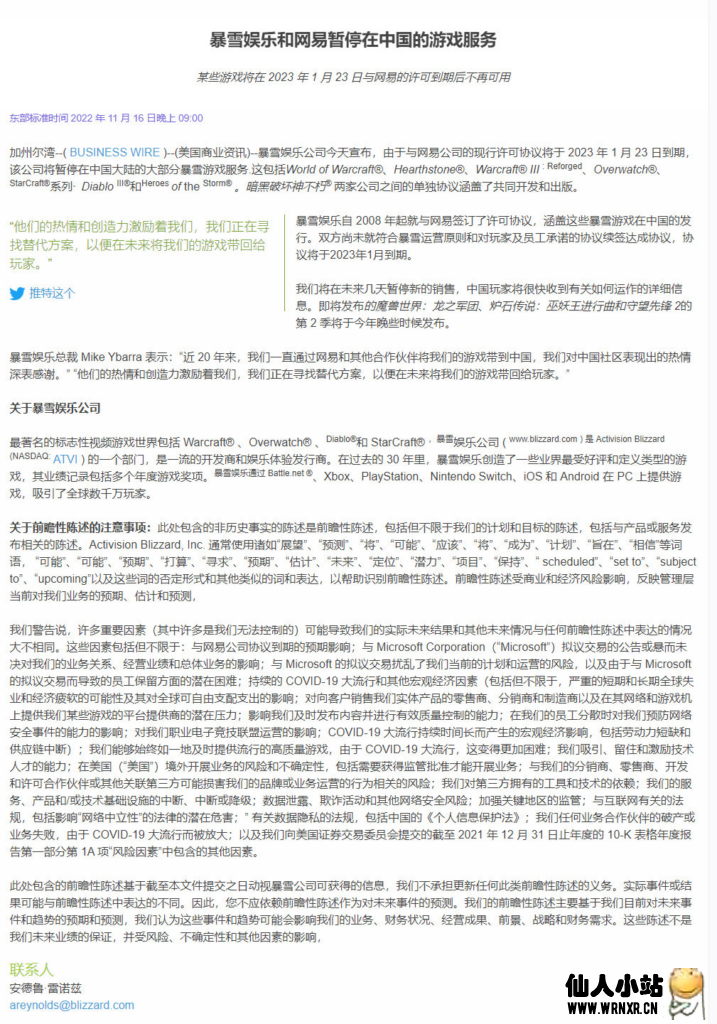 暴雪在11月16日宣布,由于与网易的现行许可协议将于2023年1月23日到期,将暂停在中国大陆的大部分暴雪游戏服务,包括《魔兽世界》《炉石传说》《守望先锋》《星际争霸》《魔兽争霸III:重置版》《暗黑破坏神III》和《风暴英雄》。